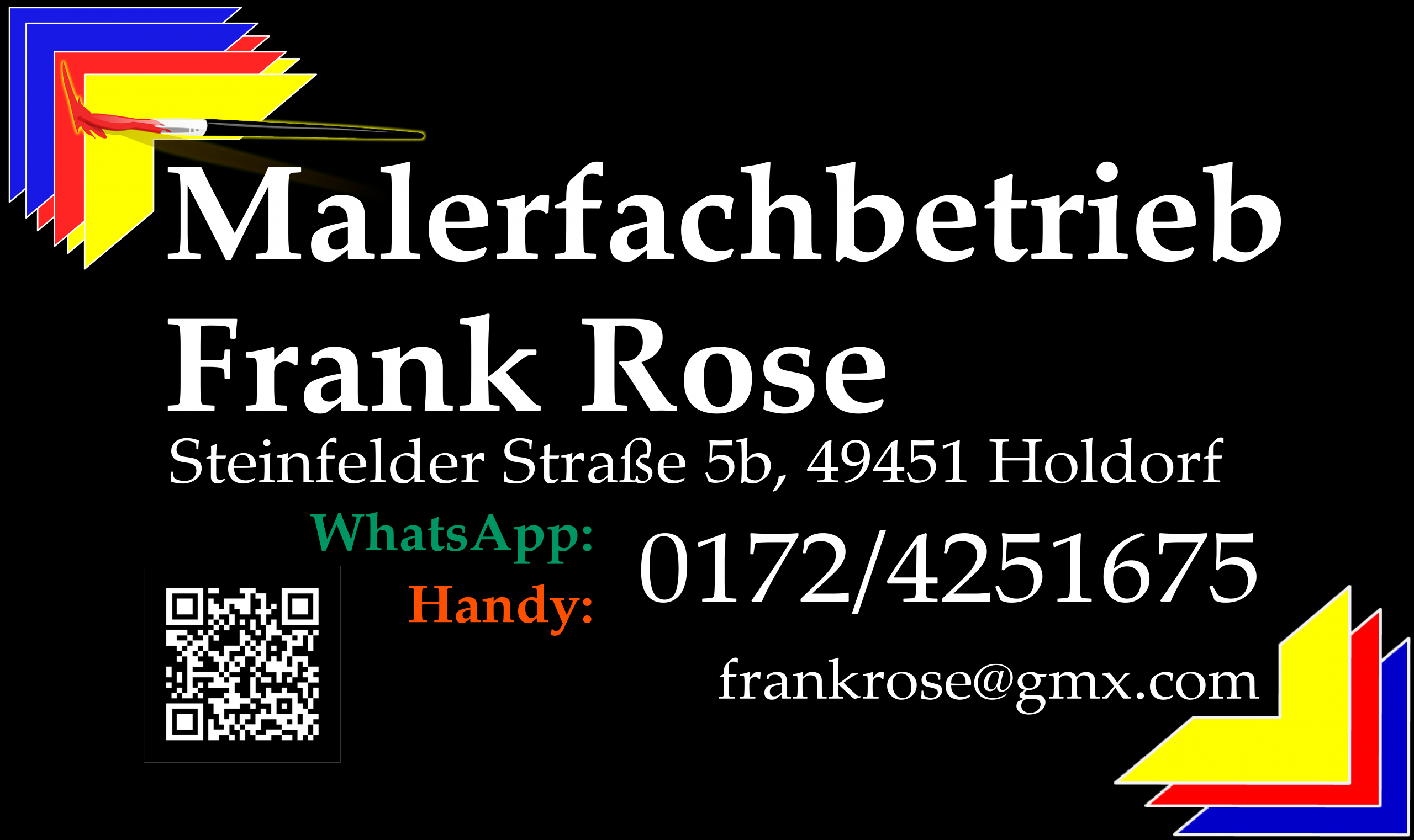 Kontaktieren Sie den Malerfachbetrieb Frank Rose in Holdorf unter 0172 4251675 oder per E-Mail an info@maler-rose.de für persönliche Beratung und Terminvereinbarung.